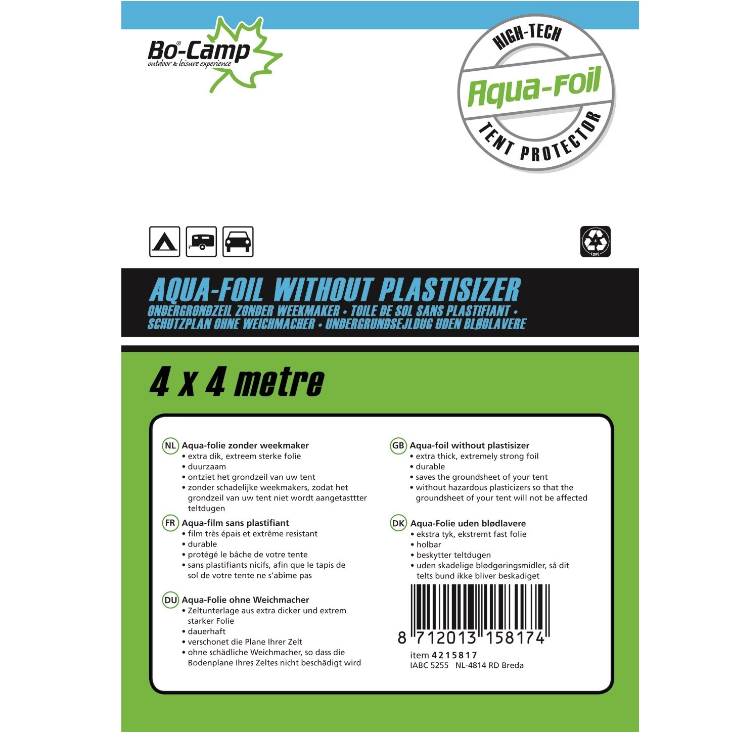 Extra dik en sterk ondergrondzeil zonder weekmakers (die het tentzeil kunnen aantasten). Zorgt dat het grondzeil van de tent niet vies wordt en dat optrekkend vocht wordt tegengehouden. Een extra voordeel van dit zeil is dat het geen vocht of water doorlaat, zodat de spullen in de tent ook droog blijven. Afmeting is 400 x 400 cm. Gemaakt van 0,1 millimeter ‘low density polyethyleen’ (LDPE).